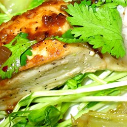 Grilled halibut is served with a delicious sauce featuring black beans, shallots and rice wine.